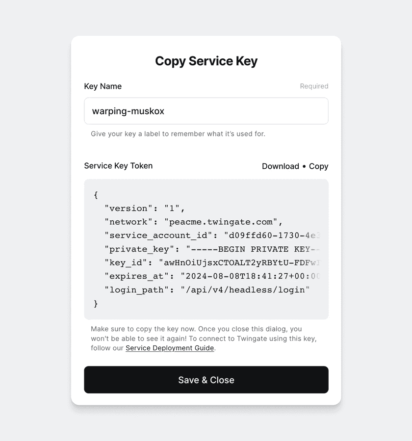 Service Keys are used to authorize access to all Resources assigned to a Service. Any Service Key that has not been revoked or has not expired can be used to access Resources assigned to a Service. Service Key expiration can be configured at creation time and expire after 365 days by default. - One or more Resources assign to a Service.
