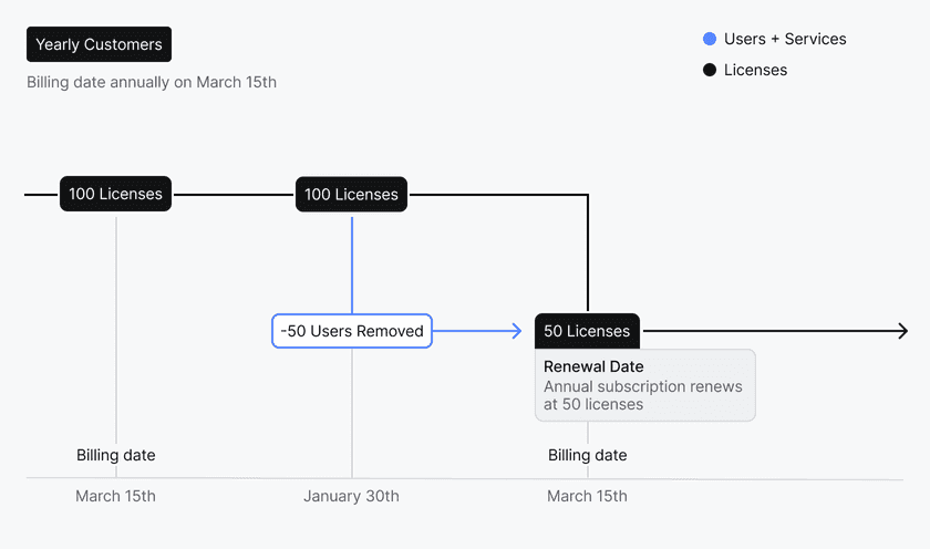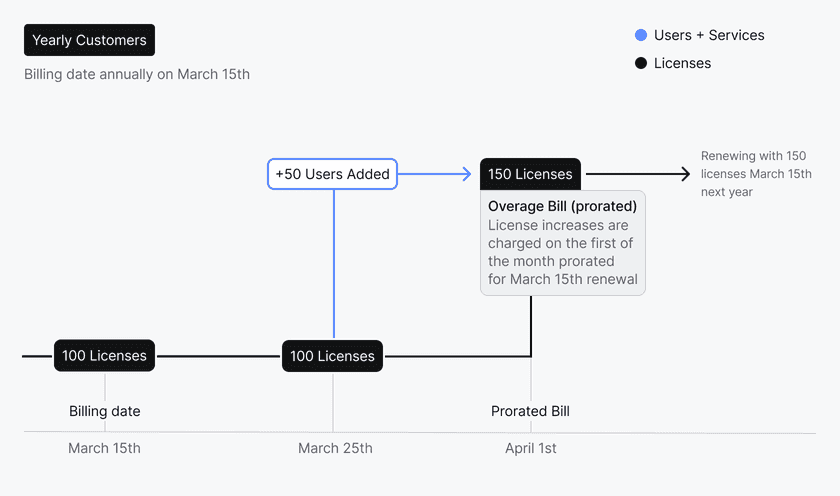 At each renewal date, annual customers will be automatically billed based on the total number of Users and Service Accounts on the last day of the previous billing cycle. Any additional Users and Service Accounts created mid-billing cycle will incur a prorated charge at the beginning of each calendar month during your subscription and subsequent charges will reflect the new total. Any reduction in Users and Service Accounts will be applied at the start of the next billing cycle.