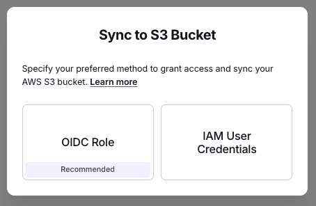 For smaller teams or simpler environments without an identity provider, you can also configure S3 sync using static IAM user credentials. While still supported, this method requires careful handling due to its reliance on long-lived access keys and manual rotation.