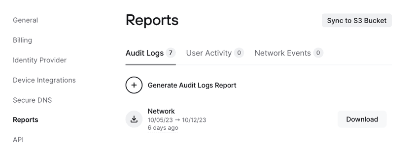 - Logs should start syncing within 10 minutes. Any subsequent audit log, network events, and DNS filtering logs will be synced to your S3 bucket every 5 minutes on an ongoing basis.