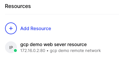 resource "twingate_resource" "resource" { name = "gcp demo web sever resource" address = google_compute_instance.vm_instance_webserver.network_interface.0.network_ip remote_network_id = twingate_remote_network.gcp_demo_network.id group_ids = [twingate_group.gcp_demo.id] protocols { allow_icmp = true tcp { policy = "RESTRICTED" ports = ["80"] } udp { policy = "ALLOW_ALL" } }}As you can see, this is restricting access to port 80. You will want to alter this depending on the application you are using.