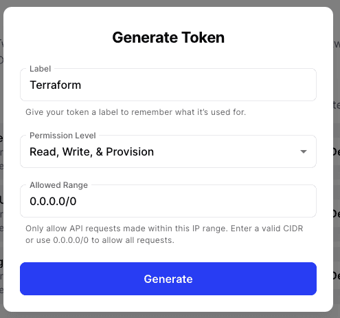 You will need to set your token with Read, Write & Provision permissions, but you may want to restrict the allowed IP range to only where you will run your Terraform commands from.