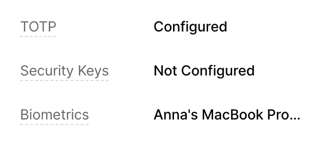 - Security Keys (WebAuthn): use a third-party security key (e.g. Yubikey) to authenticate. (Note: only FIDO2/CTAP2 security keys are supported.)