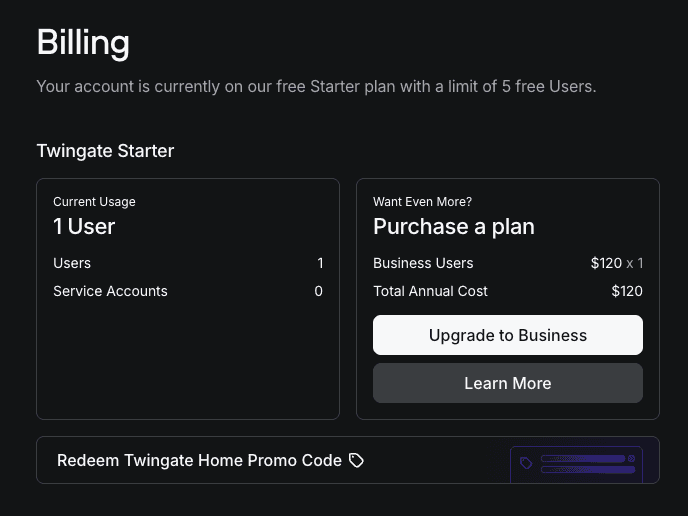 This guide shows you how to redeem your Twingate Home promo code and upgrade your Starter plan account.