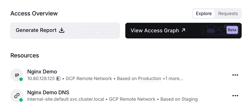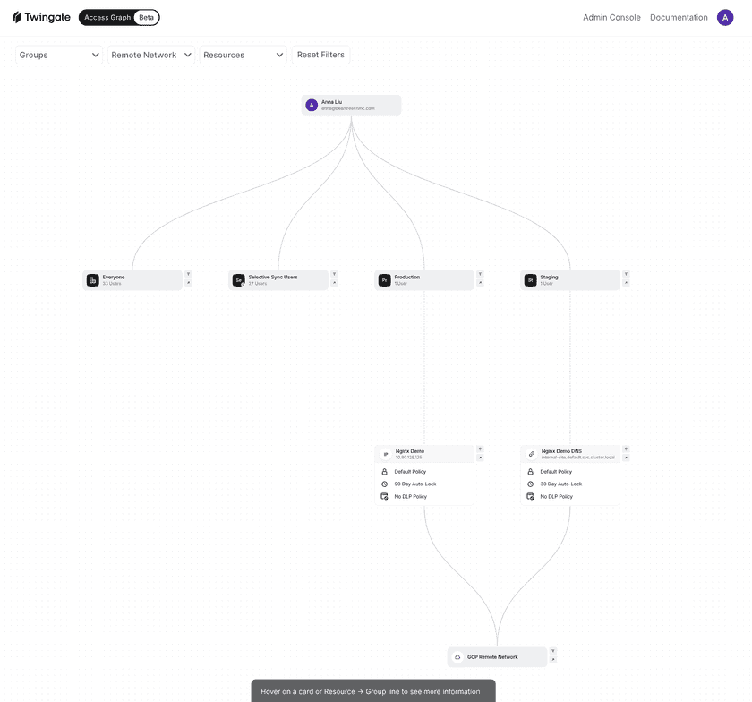 Viewing the Access Graph will allow you to see a mapping of the groups, Resources, and the paths and policies applied. You can also apply filters to limit the graph to specific Groups, Remote Networks, or Resources.