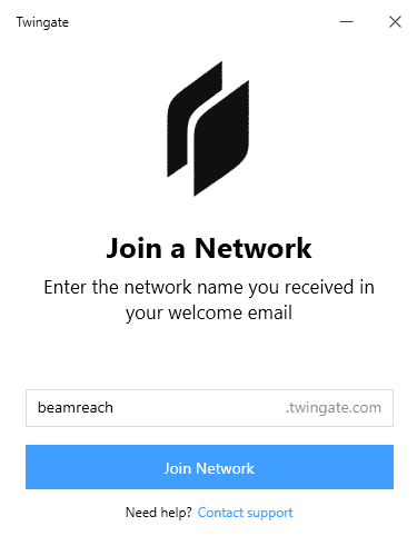 The first time you run Twingate, you need to provide the name of your Twingate network. This is “Beamreach” in the example shown below.