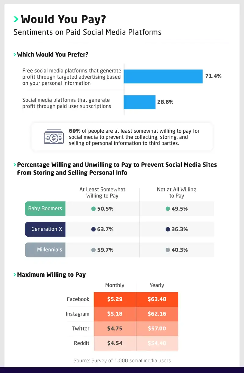 While a vast majority of users (71%) prefer a model where social media remains free but profits through targeted ads based on their personal information, another 29% disagreed. In fact, 60% of users were at least somewhat willing to pay to use social media if it meant the platforms wouldn’t collect, store, or sell their data to third parties – younger users were the most likely to say so, including 64% of Gen Xers and 60% of millennials.
