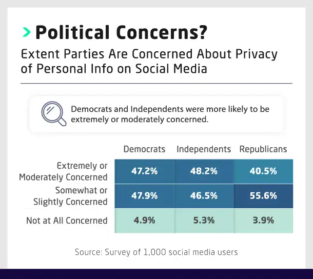 When asked how concerned they were about the safety of their private data on social media, Independent voters (48%) were the most likely to express extreme or moderate concern, followed by Democrats (47%) and Republicans (41%).