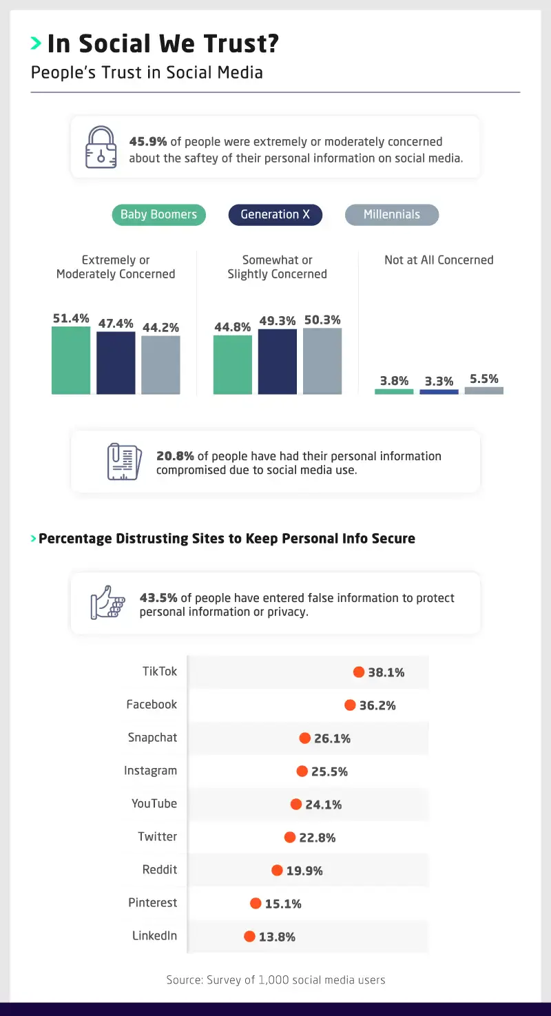 When asked which social media platforms they trusted the least, TikTok (38%), Facebook (36%), and Snapchat (26%) were voted as the least likely to keep users’ personal info safe. In contrast, those surveyed were most likely to trust LinkedIn, Pinterest, and Reddit with their data. As we found, 44% of users have used fake information to protect their personal data and privacy in the past.
