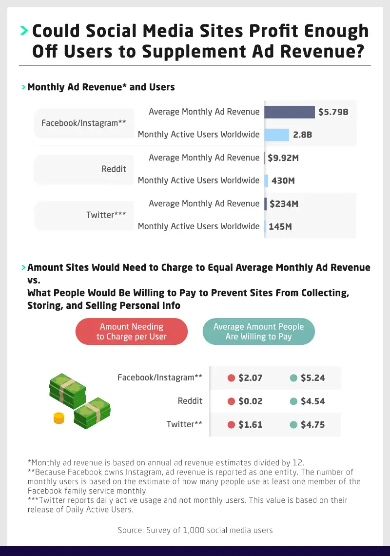Based on the $234 million Twitter earns every month in ad revenue across its 145 million users, the $4.75 respondents told us they were willing to pay to keep their data safe was far beyond the $1.61 Twitter would need to charge to maintain the same earnings. While Reddit users were willing to pay a similar amount ($4.54), the social platform would only need to charge $.02 to maintain its average of $9.9 million in monthly ad revenue.