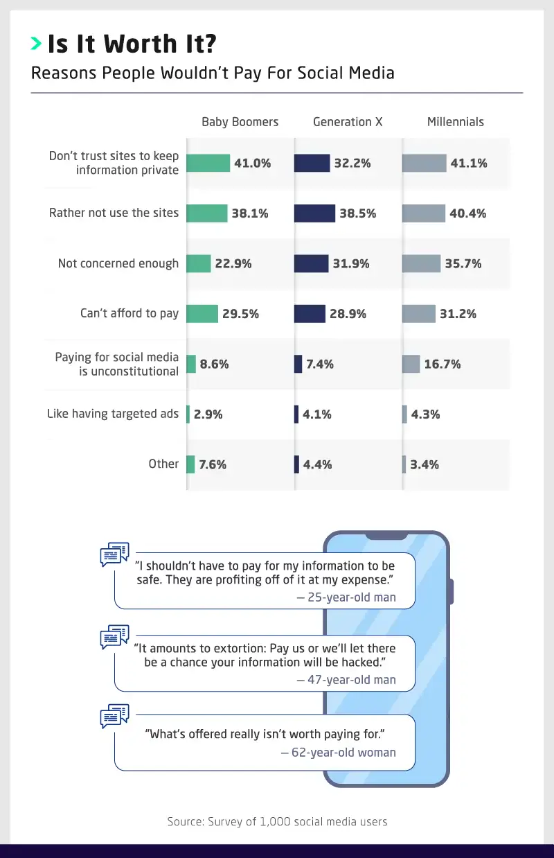 So, why aren’t more people willing to pay to keep their information safe? More than 2 in 5 baby boomers and millennials agreed they didn’t trust the social sites to keep their data private even if they paid, while 39% of Gen X users would rather not use the sites at all. Thirty-six percent of millennials, 32% of Gen X users, and 30% of baby boomers acknowledged they weren’t worried enough about their data to make it worth paying to protect.