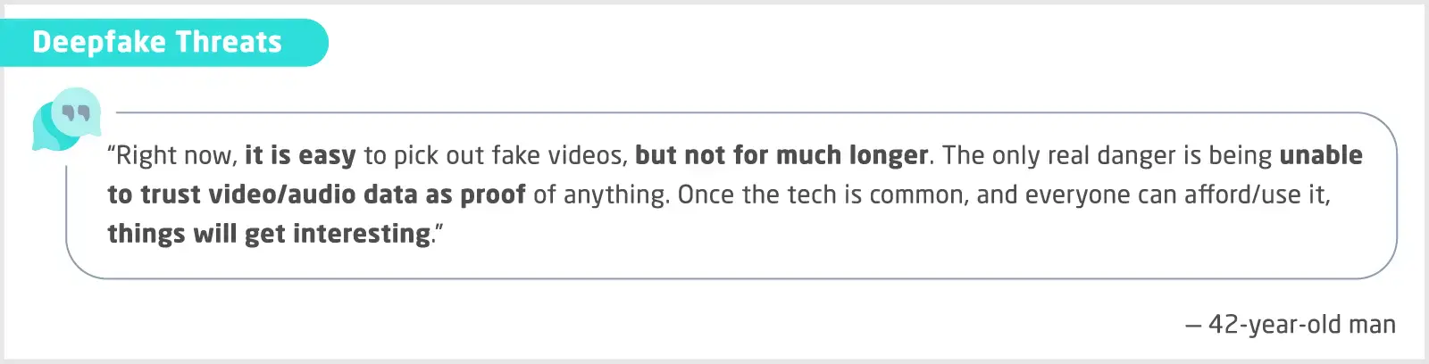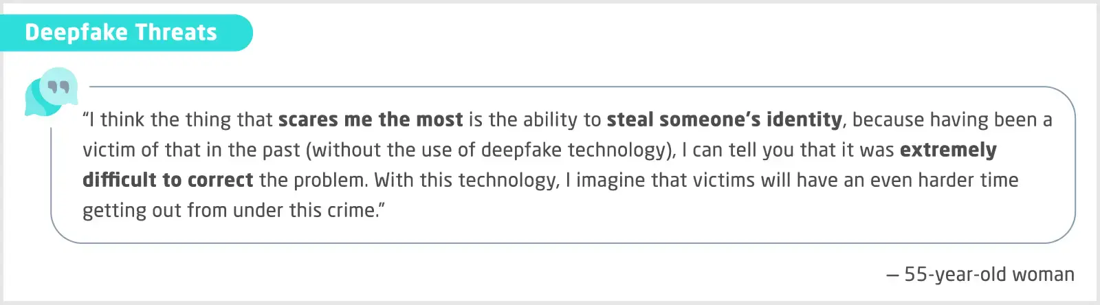 Our findings show that the majority of Americans were concerned about deepfakes, but Gen Xers and millennials in our study worried most. Perhaps it’s because they’ve spent more of their lives with technology and have seen its criminal potential more than baby boomers have.
