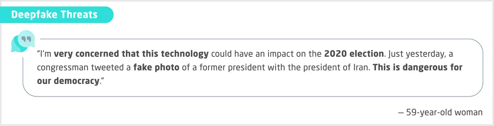 Much like facial recognition technology, digital manipulation techniques started as seemingly innocent: photoshopping hips for Instagram “likes” or manipulating one’s skin tone in a photo. However, deepfakes have since evolved, and our findings show the majority of Americans are concerned about deepfake technology being used to spread political misinformation.