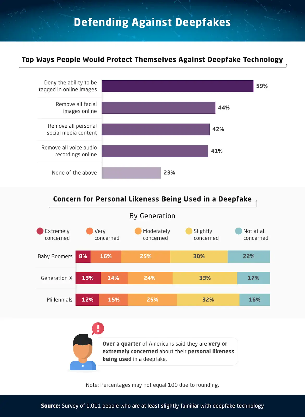 The No. 1 way people said they would protect themselves from deepfakes is by denying others the ability to tag them in online photos. Forty-four percent of Americans would go as far as removing all of their facial images from the internet, and 42% said they would delete social media content.