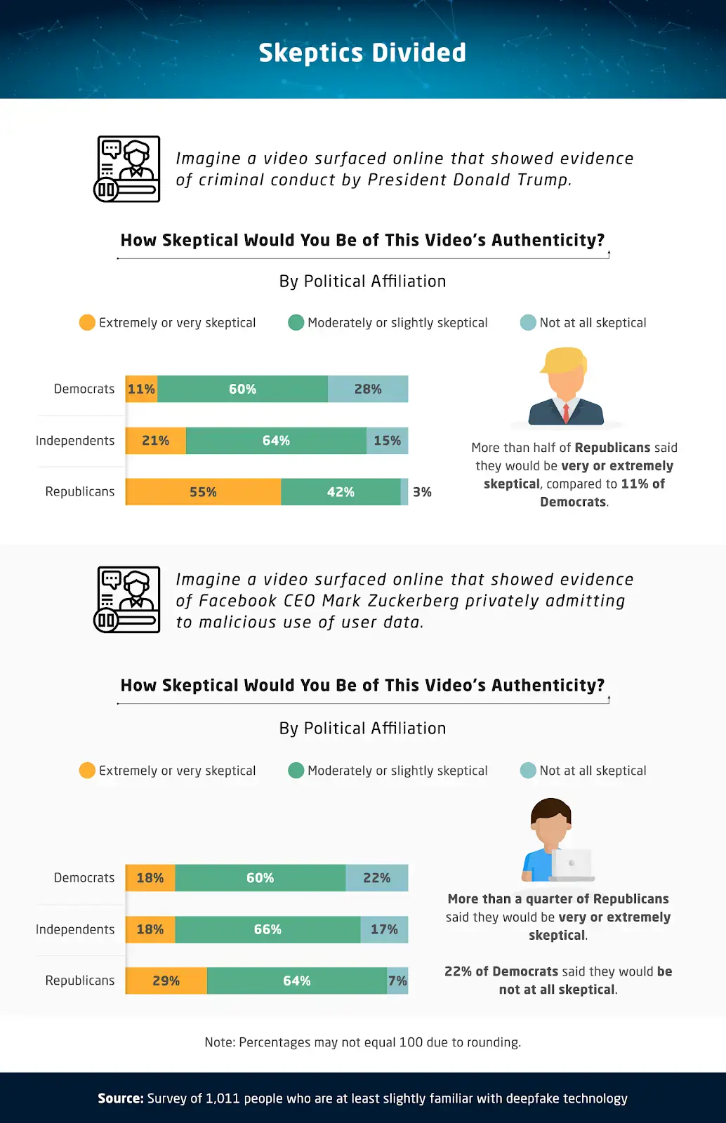 The sentiment isn’t the same for Mark Zuckerberg. Only 29% of Republicans would be very or extremely skeptical of video evidence showing the Facebook CEO admitting to malicious activity, compared to 18% of Democrats and Independents.