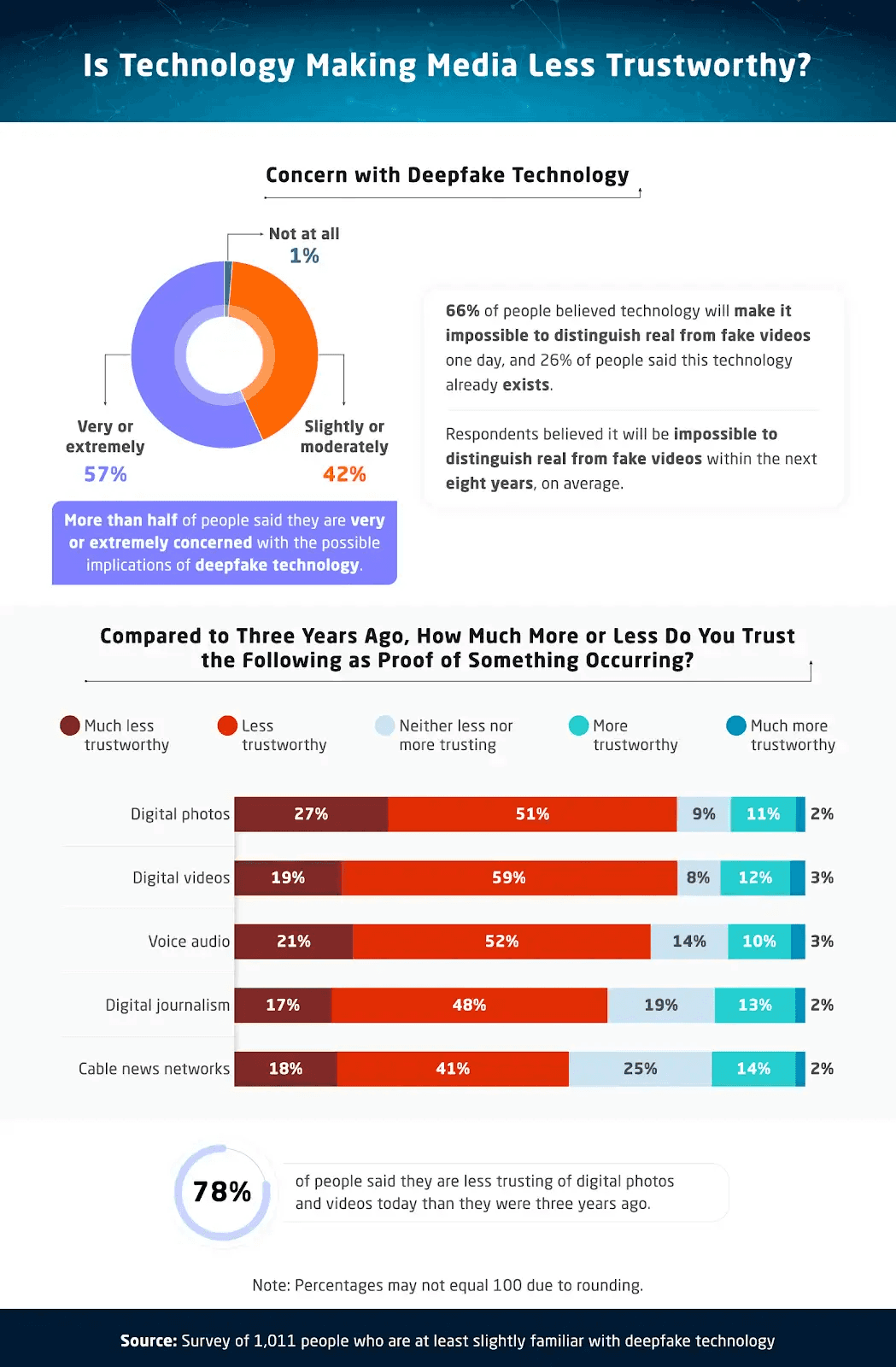 That’s a question people are concerned about. Two-thirds of participants believed that one day it would be impossible to discern a real video from a fake one. While more than 1 in 4 thought fake digital media is already taking the place of factual information, most people believed it would take about eight years, on average, before nothing can be trusted.