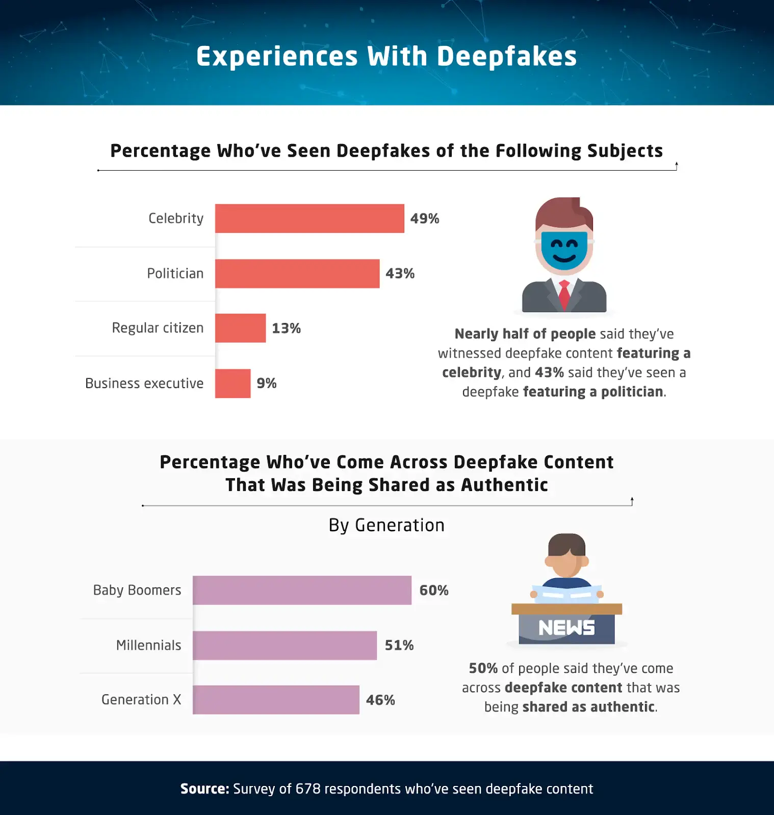 It’s one thing if someone believes an article from The Onion is factual, but it’s alarming when a news source or a viral Facebook post disseminates deepfakes. Yet, half of the people surveyed said they’ve come across deepfakes being shared as authentic content.