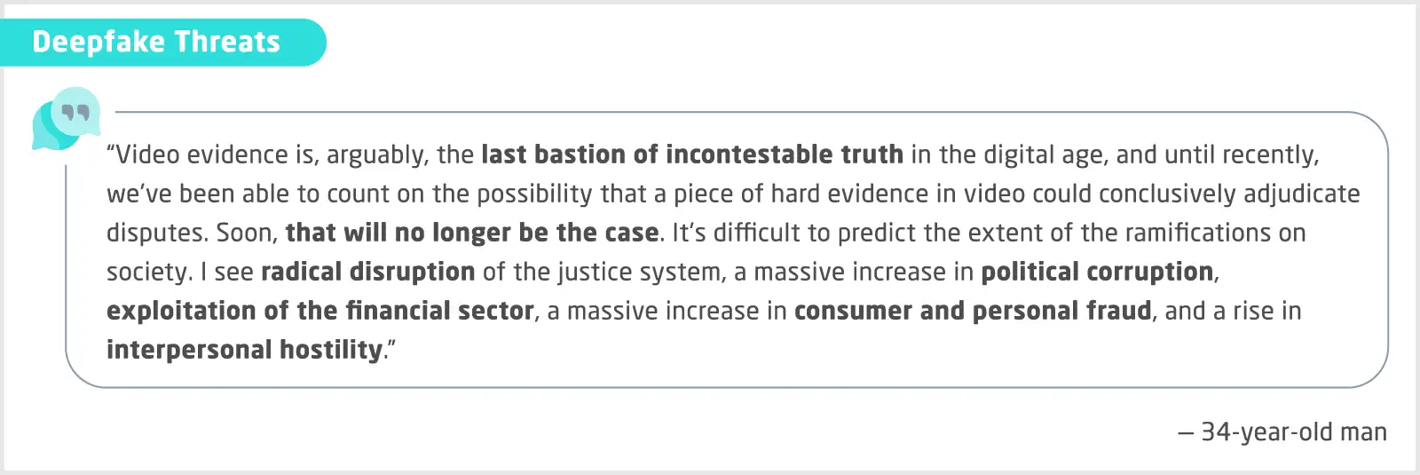 More than half of the participants in our study were very or extremely concerned with the implications of deepfake technology. We’re looking at the equivalent of “fake news” here, and the beginning of a movement that seeks to break people’s confidence in the truth, because what is truth when everything can be altered?